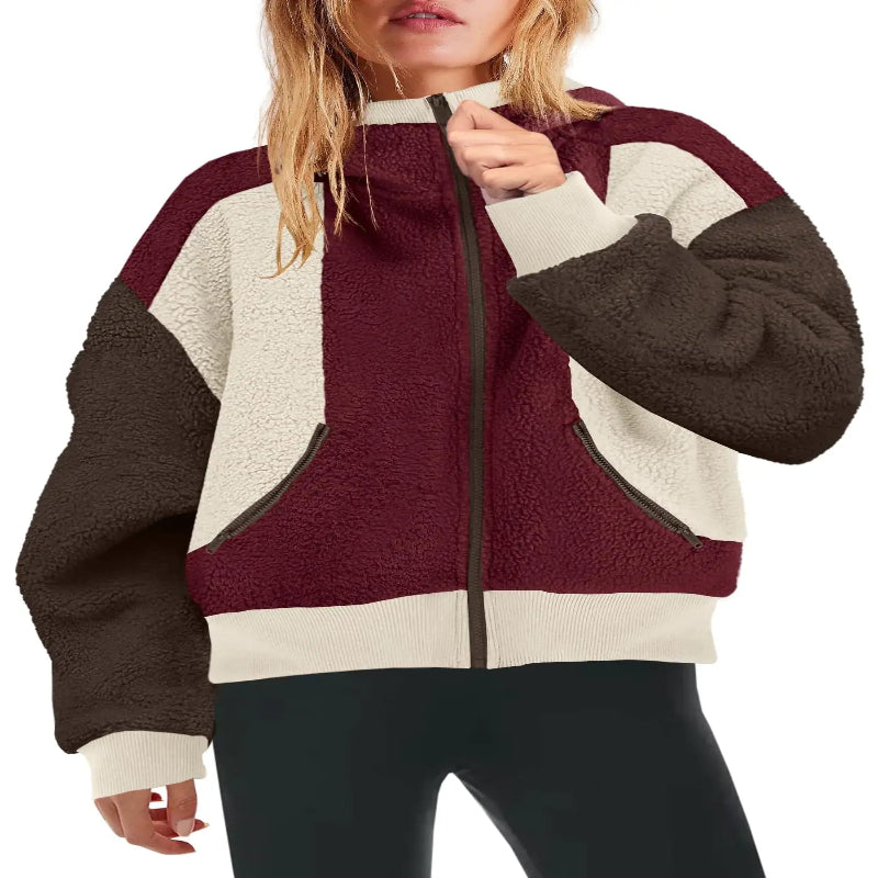 Yanekop Womens Oversized Sherpa Jacket in burgundy and cream, perfect for trendy and cozy winter wear.