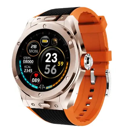 UrbanPulse smartwatch for men with orange strap and sleek digital display showcasing fitness stats and notifications.